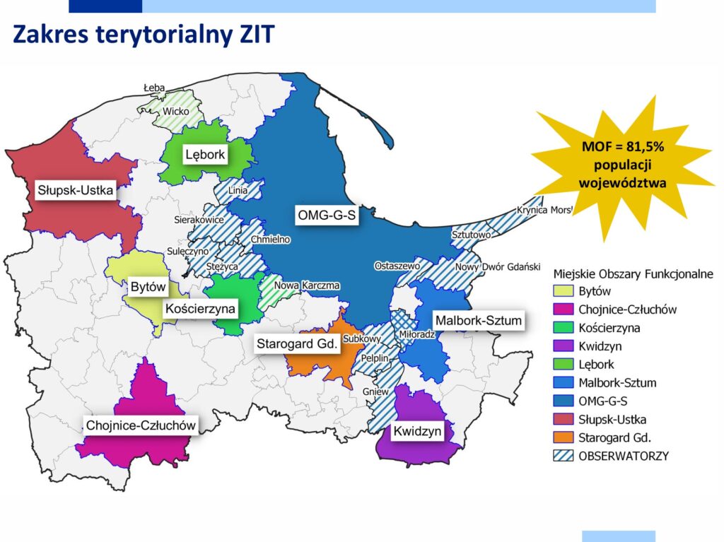 MOF w ramach instrumentów terytorialnych ZIT obejmują 81,5% populacji województwa pomorskiego. W skład dziewięciu MOF wchodzą: